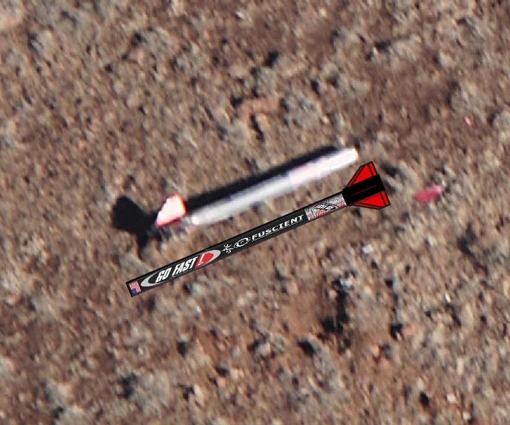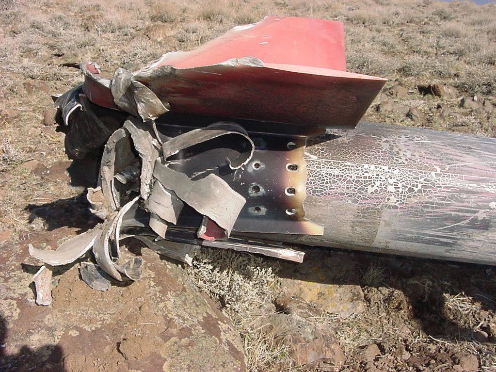 Here is an aerial photo of the booster as found by pilot Ken Samuelson. The original booster section is the drawing below for comparison. The top 2.5 feet were crushed and the fin can broke loose and is now located at the top end of the booster section.